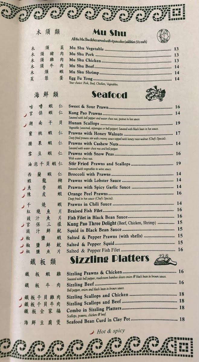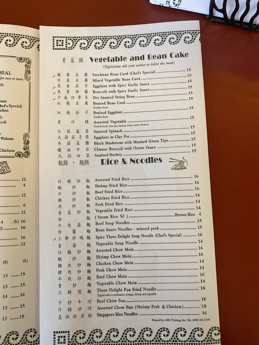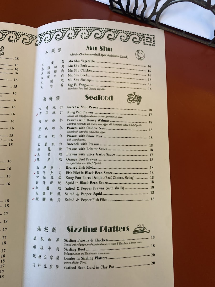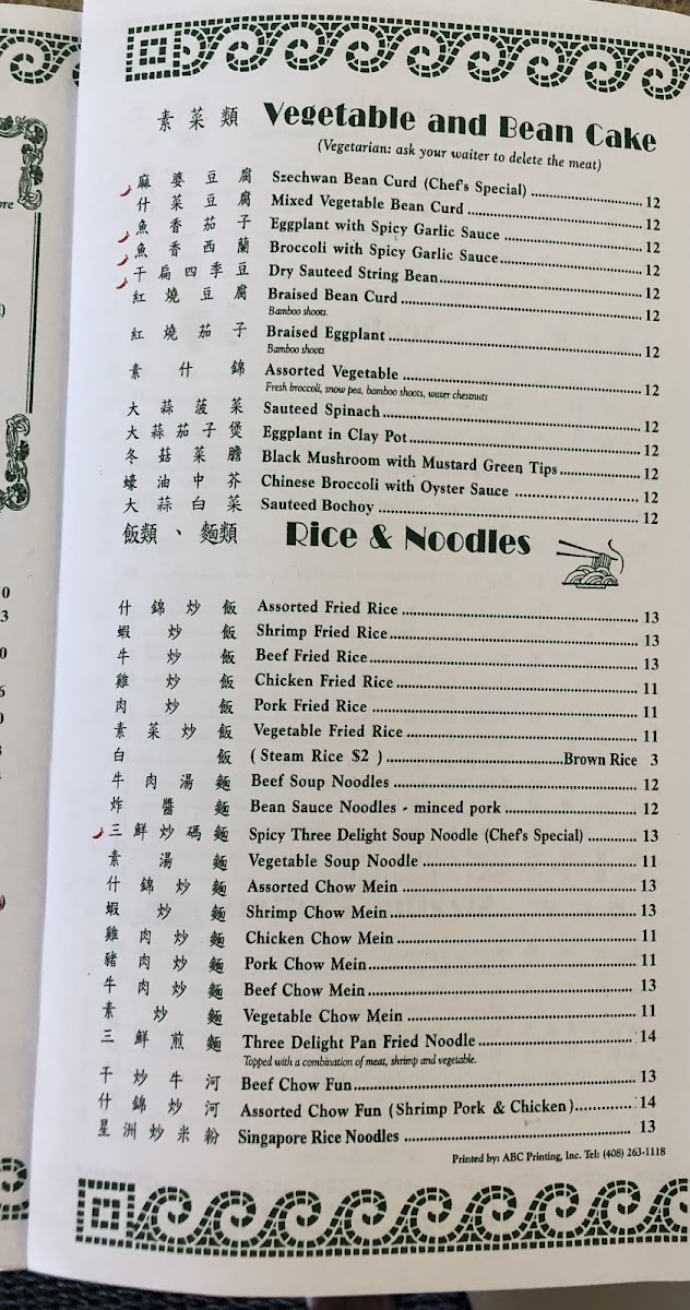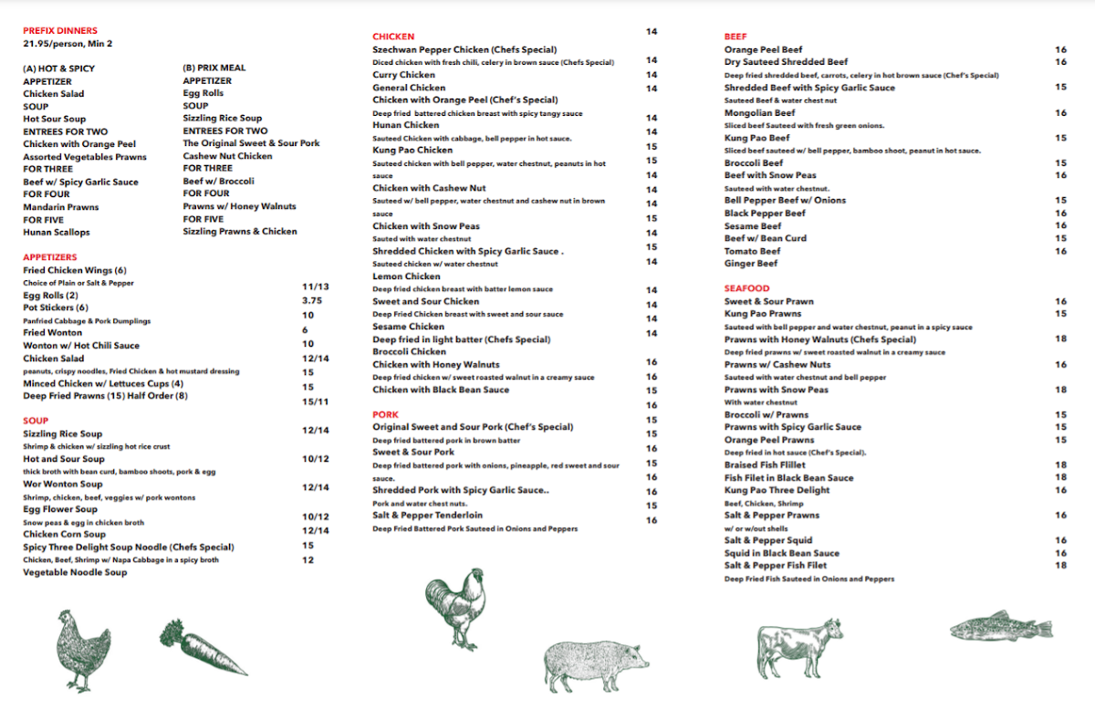 Additional categories include chicken, seafood, vegetable dishes, fried rice, noodle dishes, and salads, allowing for varied meal options. The menu also features beer and wine selections.