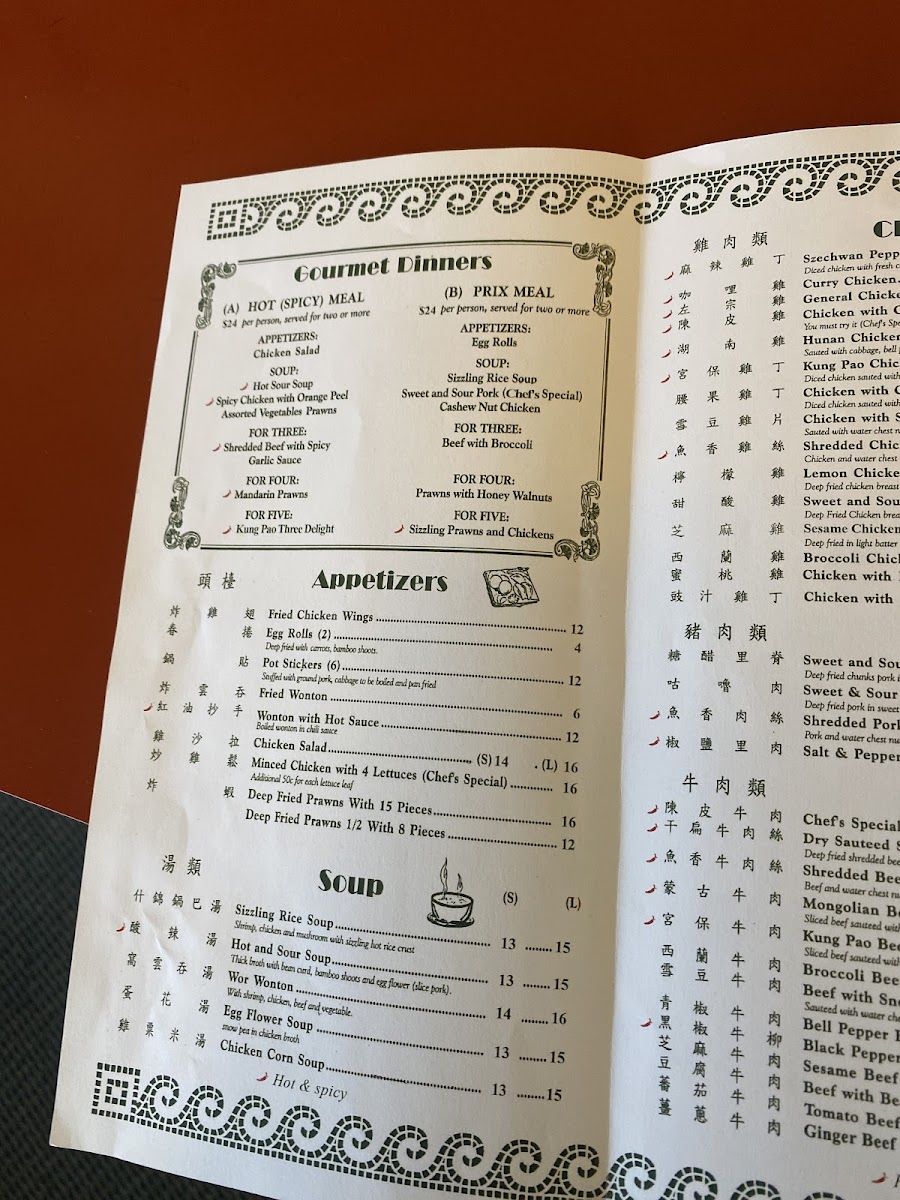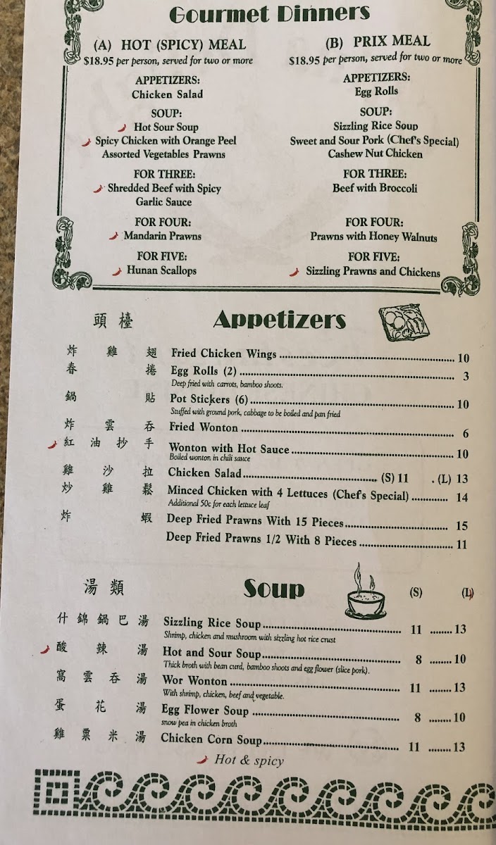 Soups are available in small and large portions, featuring choices like sizzling rice soup with chicken and shrimp, hot and sour soup with tofu, bamboo, egg flower, and sliced pork, as well as wor wonton soup containing shrimp, chicken, and beef.